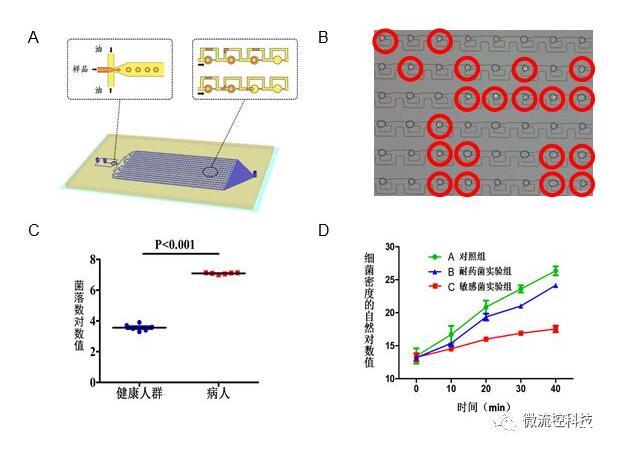 圖3A.液滴微流控芯片原理設(shè)計(jì)圖結(jié)構(gòu)包含上游的液滴生成區(qū)和下游的液滴捕獲區(qū);B.利用液滴熒光成像分辨細(xì)菌陽性和陰性液滴;C.液滴數(shù)字化分析顯示健康人和尿路感染病人尿液細(xì)菌計(jì)數(shù)差別;D.液滴數(shù)字化分析顯示敏感和耐藥細(xì)菌對(duì)于抗生素的反應(yīng)。