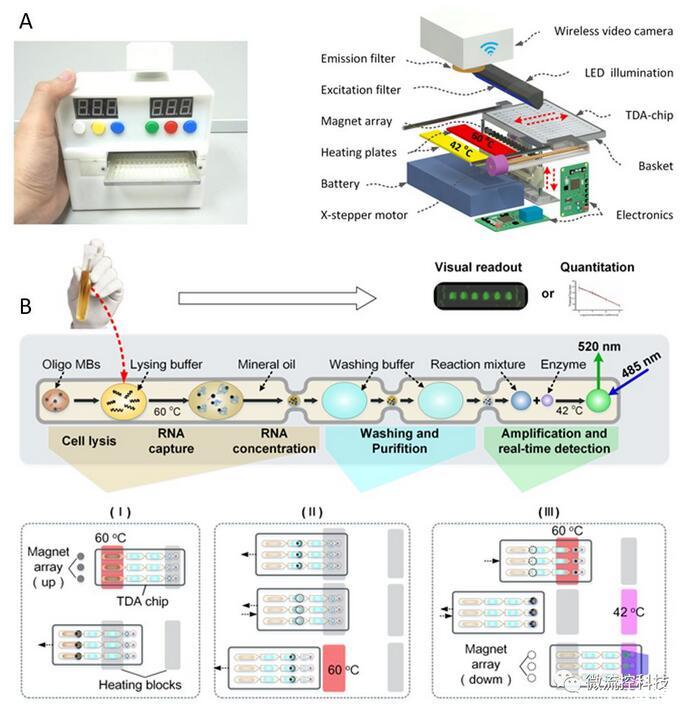 分子診斷是新興的檢驗(yàn)醫(yī)學(xué)領(lǐng)域。隨著熒光定量PCR的推廣,基因檢測(cè)技術(shù)在臨床醫(yī)學(xué)中得到了廣泛應(yīng)用。盡管如此,現(xiàn)有核酸分析平臺(tái)的一些不足之處還是限制了分子診斷技術(shù)的推廣:1)場(chǎng)地要求嚴(yán)格,試劑準(zhǔn)備、核酸提取和擴(kuò)增需要分別在獨(dú)立房間內(nèi)進(jìn)行,極大限制了該技術(shù)在醫(yī)療資源有限條件下的開展;2)采用離線式分析,操作復(fù)雜、分析周期較長,不利于應(yīng)對(duì)突發(fā)性事件;3)現(xiàn)有的熒光定量PCR方法多是針對(duì)單一指標(biāo)檢測(cè)設(shè)計(jì),對(duì)于多重基因檢測(cè)無論是操作繁瑣程度還是測(cè)試成本均是難以接受的。