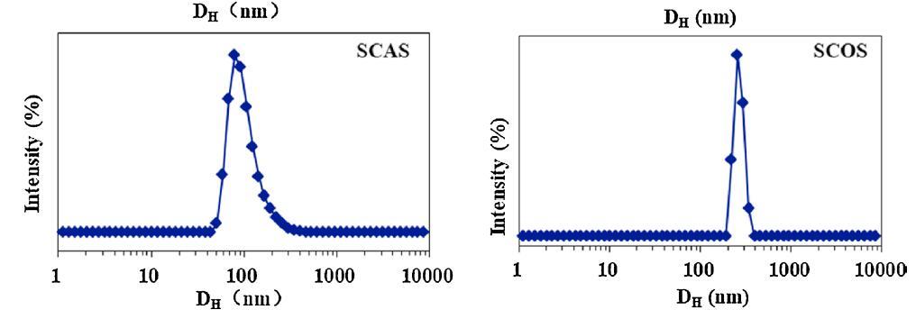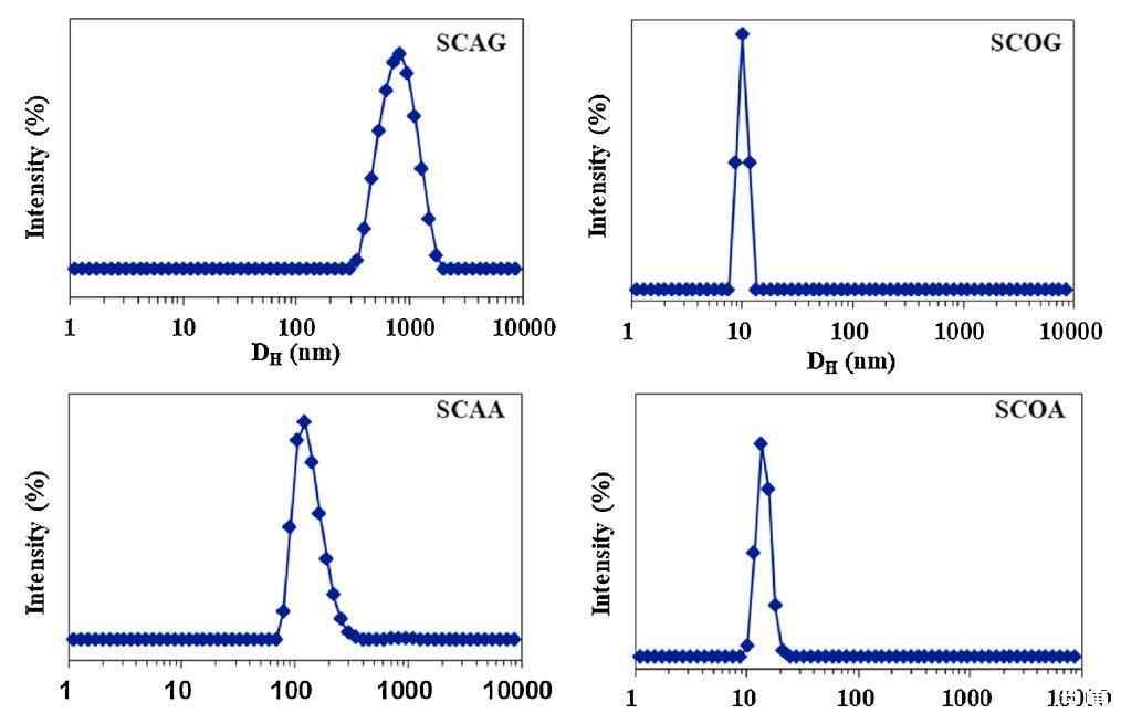 用DLS測量在6種?;被岜砻婊钚詣┧芤褐行纬傻木奂w的大小和分布,其CMC為5倍,5×CMC。圖2顯示了它們的表觀等效流體動(dòng)力學(xué)直徑(DH)。除絲氨酸外,蓖麻油表面活性劑的DH分布普遍大于棉籽油表面活性劑的DH分布。SCAG和SCAA的DH分布分別集中在900和150 nm,而SCOG和SCOA聚集體的直徑約為10 nm。對于絲氨酸,SCAS和SCOS的平均DH值分別約為100 nm和250 nm。這些結(jié)果可以通過蓖麻油衍生的表面活性劑的蓖麻油基和絲氨酸頭部基團(tuán)上都存在-OH基團(tuán)來解釋,促進(jìn)了大聚集體,例如囊泡的形成(圖2)。
