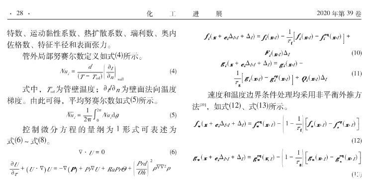 【摘要】:采用格子-玻爾茲曼方法 (LBM)構建了考慮表面張力影響下封閉腔體內(nèi)加熱圓柱外自然對流數(shù)學模型。在分別對自然對流與表面張力模型模擬驗證的基礎上,探究了液固表面張力與重力場下浮升力同時作用下加熱圓柱外流體自然對流的傳熱特性。結果表明,在給定Ra數(shù)下(103≤Ra≤106),隨著表面張力的增大(Oh數(shù)減小),封閉腔體內(nèi)管外自然對流擾動會加劇,流型會變復雜,壁面換熱效率有明顯提高。