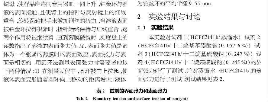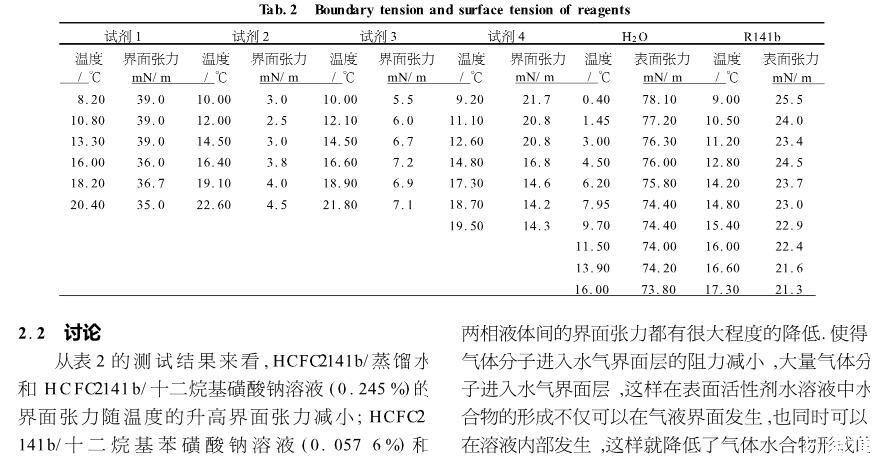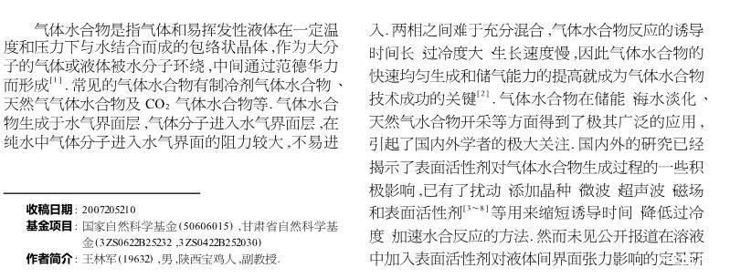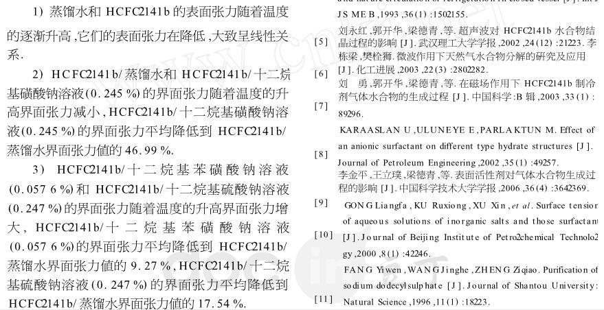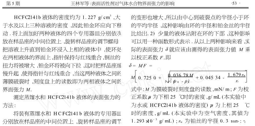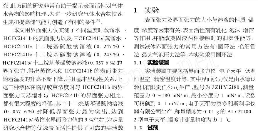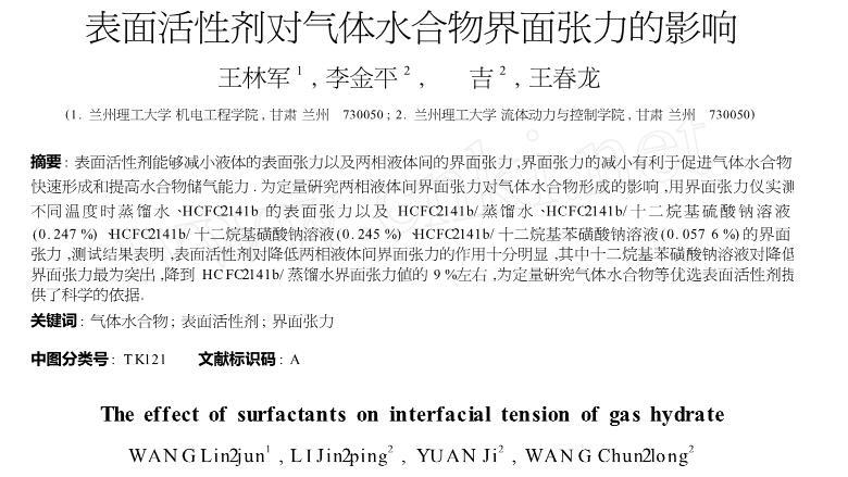 【摘要】:表面活性劑能夠減小液體的表面張力以及兩相液體間的界面張力,界面張力的減小有利于促進(jìn)氣體水合物快速形成和提高水合物儲氣能力.為定量研究兩相液體間界面張力對氣體水合物形成的影響,用界面張力儀實測不同溫度時蒸餾水、HCFC-141b的表面張力以及HCFC-141b/蒸餾水、HCFC-141b/十二烷基硫酸鈉溶液(0.247%)、HCFC-141b/十二烷基磺酸鈉溶液(0.245%)、HCFC-141b/十二烷基苯磺酸鈉溶液(0.057 6%)的界面張力,測試結(jié)果表明,表面活性劑對降低兩相液體間界面張力的作用十分明顯,其中十二烷基苯磺酸鈉溶液對降低界面張力最為突出,降到HCFC-141b/蒸餾水界面張力值的9%左右,為定量研究氣體水合物等優(yōu)選表面活性劑提供了科學(xué)的依據(jù)。