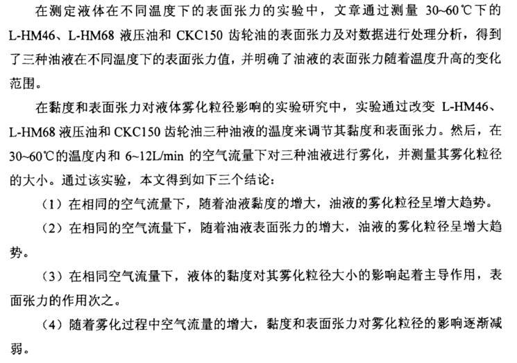 在黏度和表面張力對(duì)液體霧化粒徑影響的實(shí)驗(yàn)研究中,實(shí)驗(yàn)通過(guò)改變L-HM46、 L-HM68液壓油和CKC150齒輪油三種油液的溫度來(lái)調(diào)節(jié)其黏度和表面張力。然后,在30~60℃的溫度內(nèi)和6~12L/min的空氣流量下對(duì)三種油液進(jìn)行霧化,并測(cè)量其霧化粒徑的大小。通過(guò)該實(shí)驗(yàn),本文得到如下三個(gè)結(jié)論: