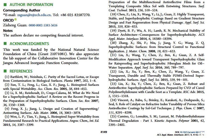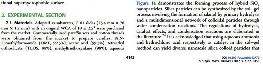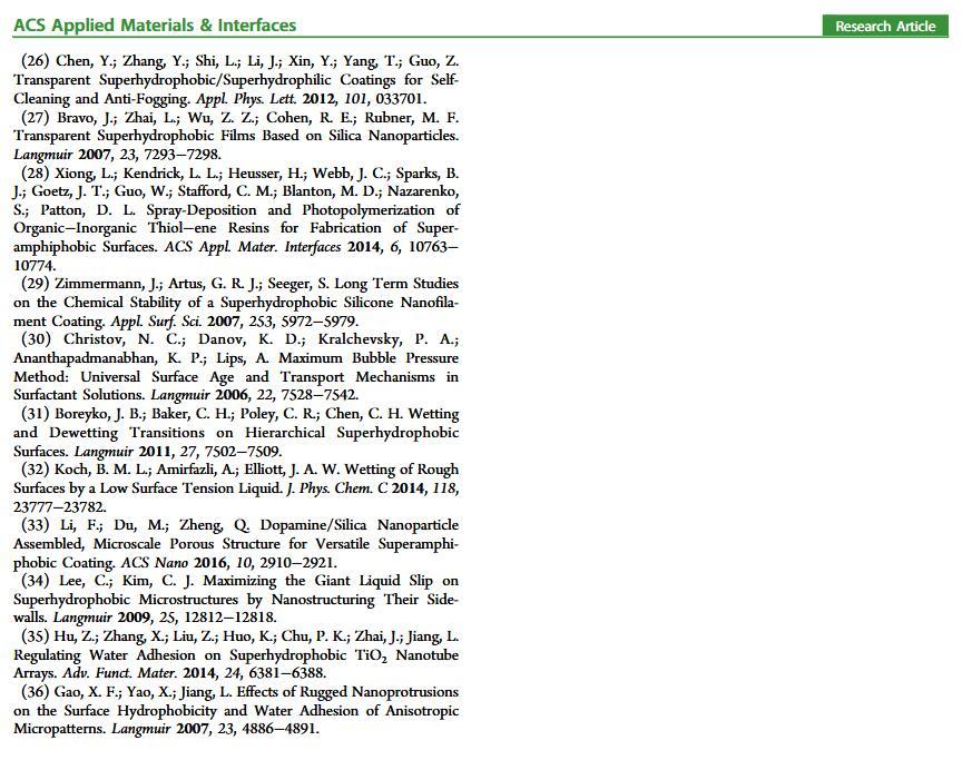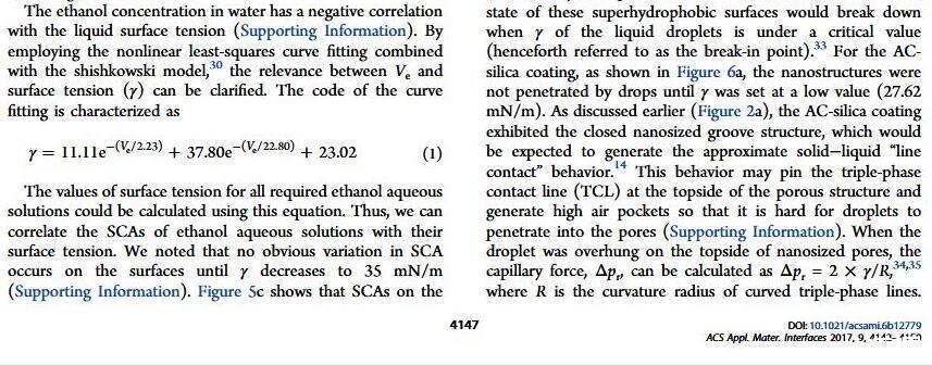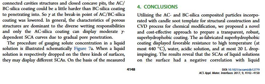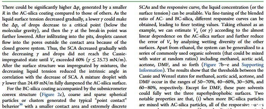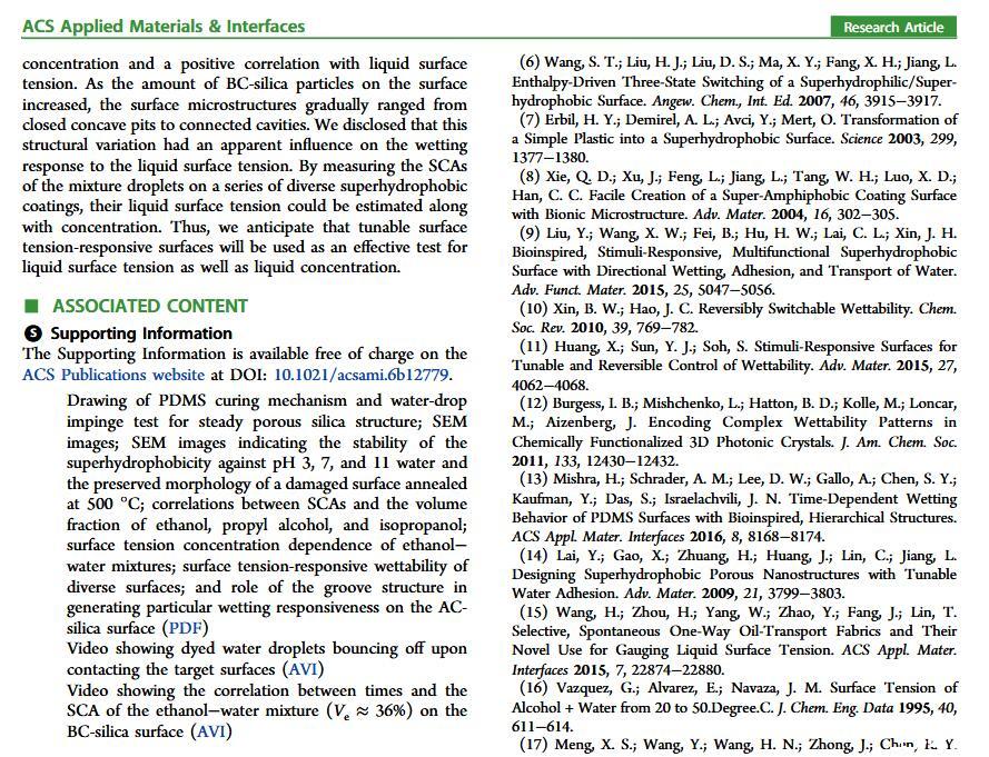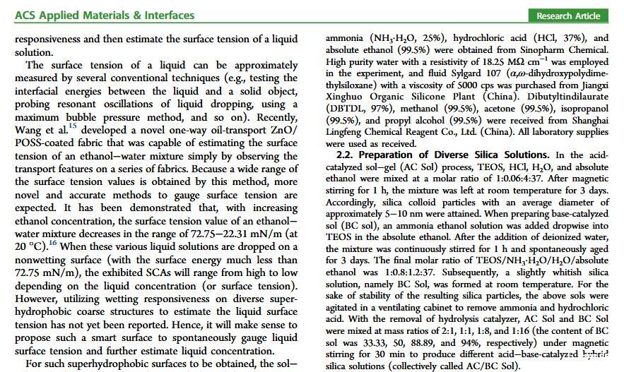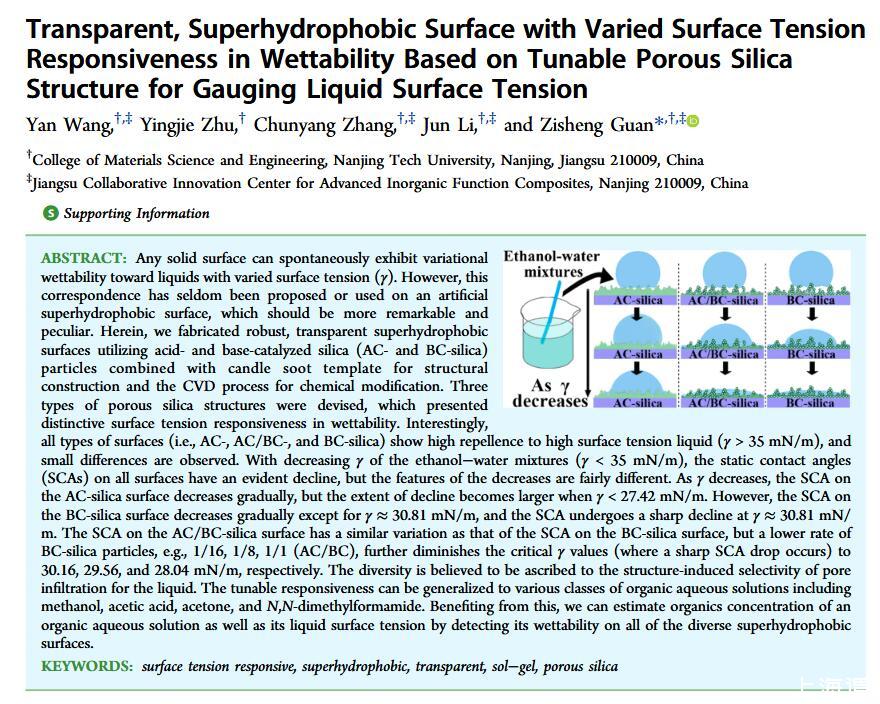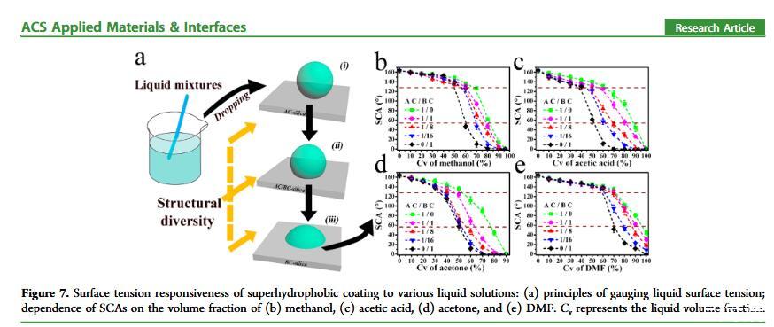 當(dāng)液體的表面張力發(fā)生變化時(shí),它在普通固體表面的潤(rùn)濕性也會(huì)隨著變化。然而,關(guān)于這一規(guī)律以及尤其是在超疏水表面的表現(xiàn)的研究很少。最近,協(xié)同創(chuàng)新中心PI-6管自生老師課題組研究生王研等人利用上述的表面張力和潤(rùn)濕性的響應(yīng)關(guān)系首次將透明超疏水涂層應(yīng)用在探測(cè)液體表面張力方面,為拓寬多功能超疏水涂層的應(yīng)用提供了一個(gè)新的思路,相關(guān)論文已被ACS applied materials&interfaces發(fā)表。研究表明,隨著有機(jī)物水溶液中有機(jī)物體積分?jǐn)?shù)上升,溶液的表面張力相應(yīng)地下降,溶液液滴在制備的超疏水涂層的接觸角也逐漸下降,此稱(chēng)之為表面潤(rùn)濕性對(duì)表面張力的響應(yīng)?;诖隧憫?yīng)關(guān)系,可以通過(guò)接觸角估測(cè)液體的表面張力以及有機(jī)物的濃度。