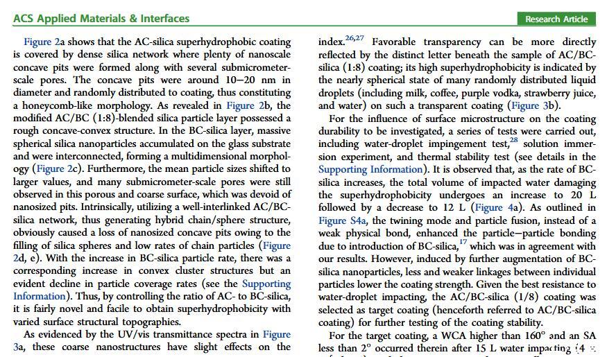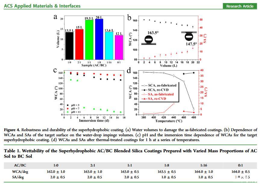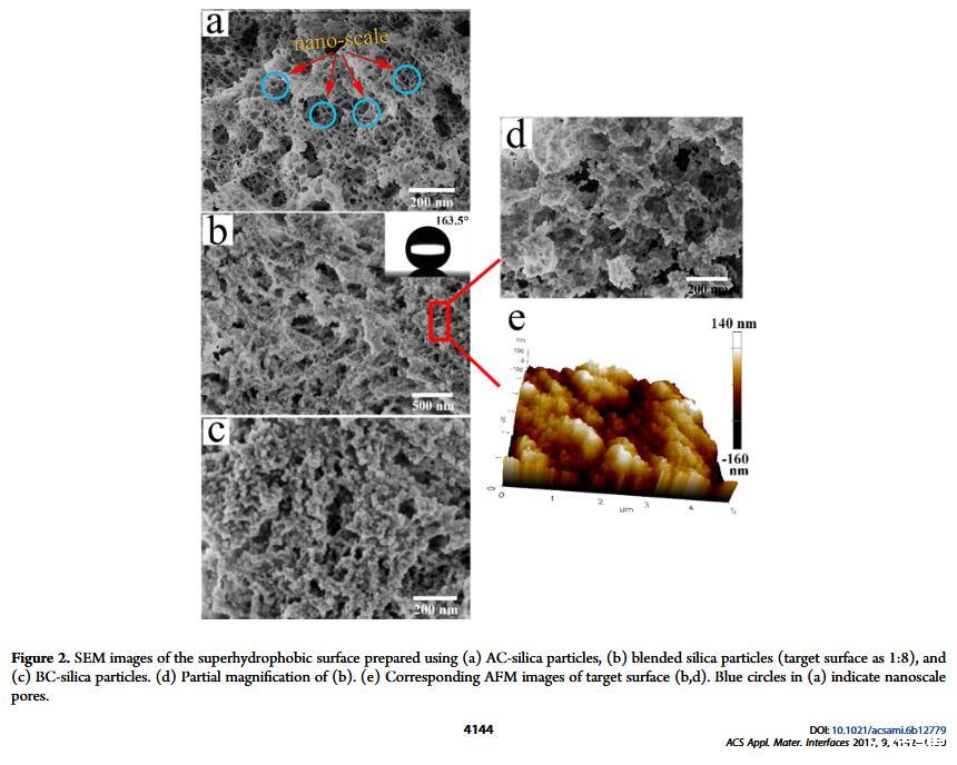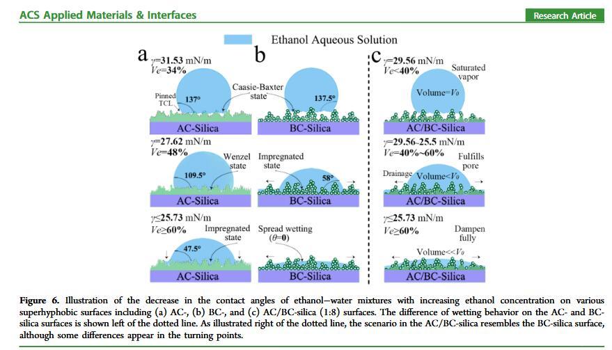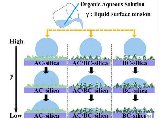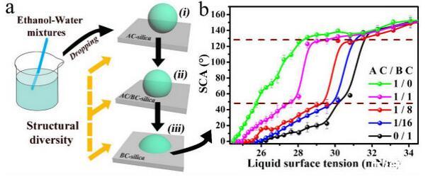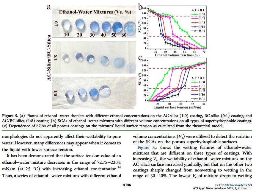 結(jié)果表明,以正硅酸四乙酯為前驅(qū)體通過(guò)酸性和堿性水解法制備了不同形貌的納米二氧化硅溶膠,通過(guò)混合兩種溶膠可制備出具有顆粒間鍵橋強(qiáng)度高的亞微米級(jí)凸起和納米級(jí)凹坑的結(jié)構(gòu)的涂層。通過(guò)控制酸堿催化溶膠混合比例,我們可以制備出具有不同微觀結(jié)構(gòu)的超疏水涂層。結(jié)果表明具有不同結(jié)構(gòu)的涂層具有不同的潤(rùn)濕性-表面張力關(guān)系,隨著涂層制備時(shí)堿催化溶膠的比重增加,納米級(jí)凹坑結(jié)構(gòu)逐漸減少,表面更容易被低表面張力液體侵入,因而接觸角下降更劇烈。并且在有機(jī)物水溶液,包括:甲醇、乙醇、正丙醇、異丙醇、乙酸、丙酮、N,N’-二甲基酰胺等,都具有同樣的接觸角和濃度(表面張力)響應(yīng)規(guī)律。