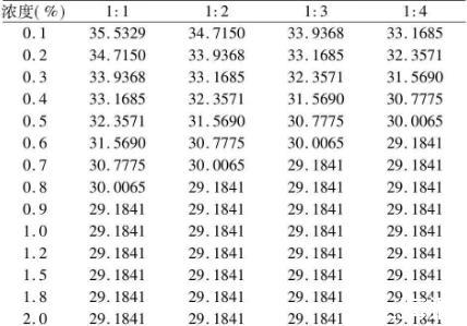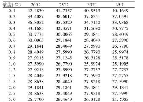 由表1可以明顯看出,同一溫度下,黃花敗醬皂甙的表面張力隨濃度的增大而顯著下降,同一濃度下隨溫度升高,表面張力下降。高溫時表面張力下降比較明顯,濃度為2.0%時表面張力不隨溫度變化而變化。cmc約為1%,σcmc約為(25~27)×10-3(N·m-1)。黃花敗醬皂甙符和表面活性劑的定義,濃度變化很小,表面張力下降很大下降到臨界膠束濃度再增加濃度表面張力也不下降。