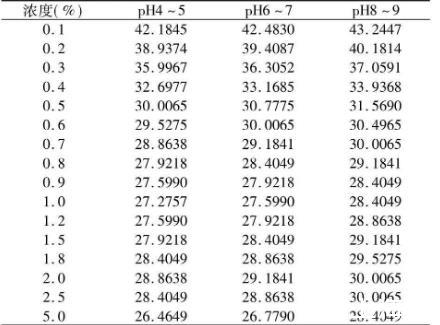 由表2可以看出,相同pH值時,黃花敗醬皂甙水溶液的表面張力隨濃度增大而明顯下降;同濃度下,pH值越大表面張力越大,且增大pH值可消除2.0%的影響,使曲線趨于平緩,pH值不影響cmc值,cmc約為1%。
