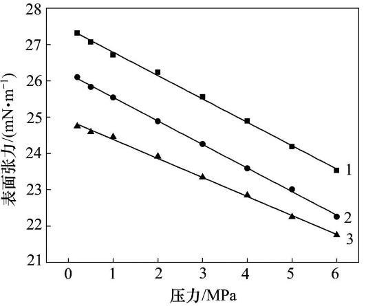 為了研究溫度和壓力對(duì)煙道氣?稠油平衡表面張力的影響,分別在80,100和120℃下進(jìn)行實(shí)驗(yàn),圖2所示為不同溫度下煙道氣?稠油平衡表面張力隨壓力變化曲線。由圖2可見:當(dāng)氣體壓力從0.2 MPa升高到6 MPa,在80℃時(shí),煙道氣?稠油表面張力由27.31 mN/m減小到23.53 mN/m,降低了13.84%;在100℃時(shí),煙道氣?稠油表面張力由26.10 mN/m減小到22.26 mN/m,降低了14.71%;在120℃時(shí),煙道氣?稠油表面張力由24.75 mN/m減小到21.75 mN/m,降低了12.12%。當(dāng)溫度一定時(shí),煙道氣?稠油系統(tǒng)的平衡表面張力隨著壓力的增大而減小,并呈較好的線性關(guān)系。這是因?yàn)闇囟纫欢〞r(shí),壓力增大,煙道氣在稠油中的溶解度增大,使得平衡表面張力減小。當(dāng)壓力一定時(shí),煙道氣?稠油系統(tǒng)的平衡表面張力隨溫度的升高而減小。這是因?yàn)闊煹罋獾闹饕煞质荖2,N2在稠油中的溶解度隨著溫度升高而增大。