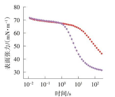 使用動(dòng)態(tài)表面張力儀用泡壓法進(jìn)行測定。C10~13MADS和2A1樣品溶液質(zhì)量濃度為1.0 g/L,測量前靜置24 h;測試溫度為(25.0±1.0)℃,有效時(shí)間為0.01~250.00 s。