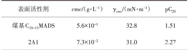 由表1可以看出,2A1的cmc低于C10~13MADS,即形成膠束的能力更強(qiáng),這是由于2A1的親水性低于C10~13MADS,疏水作用強(qiáng),有利于形成膠束。2A1的pC20值大于煤基C10~13MADS,說明2A1在去離子水溶液中降低溶液表面張力的效率高于C10~13MADS。對(duì)于碳?xì)滏溞捅砻婊钚詣?,?液界面處的—CH3密度對(duì)其表面活性起著很重要的作用,—CH3密度的增大有利于溶液表面張力的降低,同時(shí)γcmc值也逐步降低。由表1可以看出,煤基C10~13MADS的γcmc大于2A1,這是由于2A1是采用四聚丙烯得到的支鏈?zhǔn)樵现苽涞?,其疏水鏈的—CH3密度大于煤基C10~13MADS。