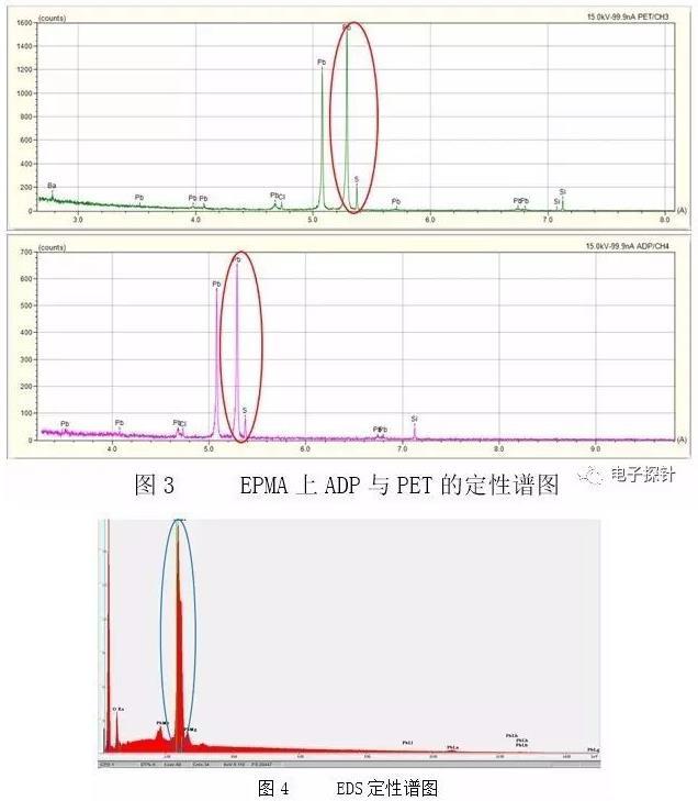 結(jié)果顯示無(wú)論是EPMA-1720上的ADP晶體還是PET晶體,其分辨率都毫無(wú)疑問(wèn)地能把S Ka(特征波長(zhǎng)0.5373nm)和Pb Ma(特征波長(zhǎng)0.5285nm)明顯的區(qū)分開來(lái),呈現(xiàn)的是分開的兩個(gè)峰,見圖3中的紅色線內(nèi)。而相同測(cè)試條件下的EDS譜圖中S Ka峰(特征能量2.308keV)已然不能使用軟件自動(dòng)識(shí)別標(biāo)出,手動(dòng)添加的結(jié)果見圖4,其與Pb的Ma峰(特征能量2.343keV)重疊在一起,不能分開。