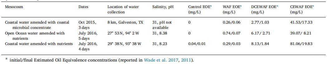 海水是從墨西哥灣收集的,用于填充 12 罐,每個 130 L,其中 4 個處理一式三份: 對照(海水)、WAF(用 Macondo 替代油,一種輕質(zhì)低硫原油,化學(xué)性質(zhì)類似于 在深水期間從 Macondo 井中溢出的石油 Horizon 事件)、CEWAF(Corexit + oil 比例為 1:20)和 DCEWAF (CEWAF 稀釋十倍)。 仔細(xì)描述了中間宇宙的設(shè)置 在韋德等人。 (2017) 以及準(zhǔn)備 WAF 的程序, CEWAF 和 DCEWAF。 簡而言之,注入油或油 + Corexit 進(jìn)入帶擋板的再循環(huán)罐并混合約 24 小時,然后將下層 分?jǐn)?shù)(即,避免表面光滑)被添加到各自的 坦克。 有關(guān)中宇宙實驗的信息在表 1 中給出 根據(jù)估計值添加初始和最終油濃度 根據(jù) Wade 等人確定的油當(dāng)量 (EOE)。 (2011 年,2017 年)。 實驗持續(xù) 3 到 5 天,運行 12:12 明暗循環(huán)。 在表 1 中,對于使用沿海 用微生物濃縮物修正的水域,浮游生物(≥63 μm)是 用網(wǎng)收集并轉(zhuǎn)移到聚碳酸酯瓶中。 這個 將濃縮的浮游生物塊引入罐中并攪拌(2 L 到每個)在開始實驗之前。 對于公海水域和沿海水域的中宇宙,營養(yǎng)物質(zhì)進(jìn)行了修正, 添加營養(yǎng)物(最終濃度 f/20)并攪拌罐。